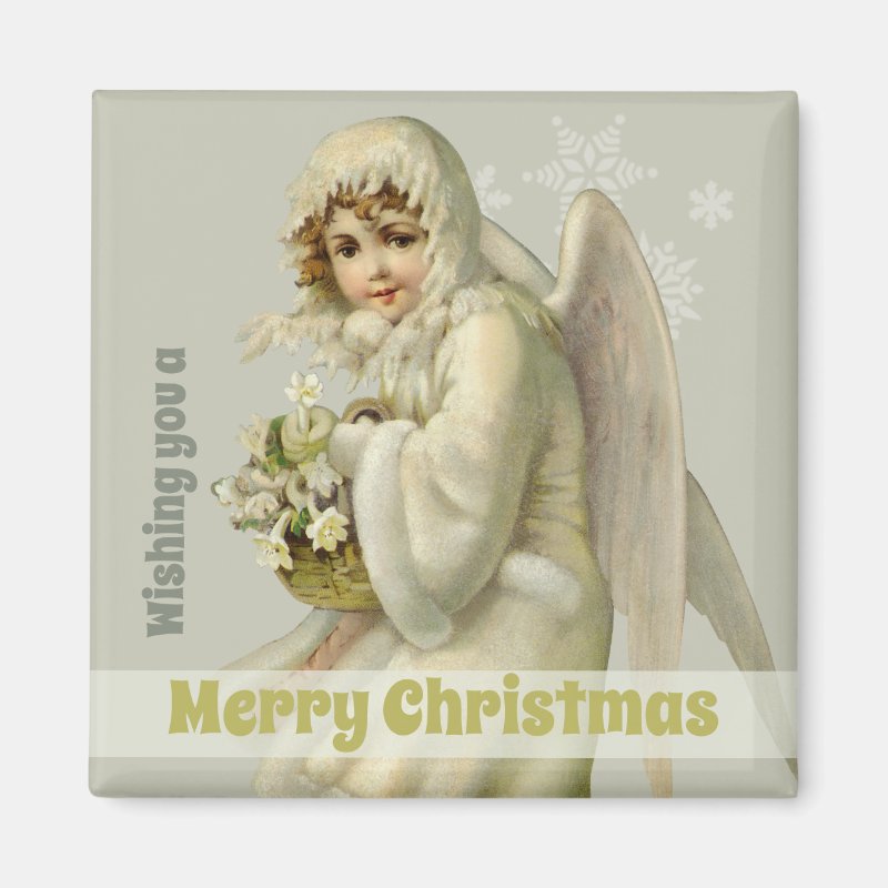 Square Christmas magnet inspired by an unusually sweet Victorian child angel. The angel child is a so called snow angel dressed in a warm fur coat and also carrying a basket of white flowers.Suitable for anyone that may be longing for the warmth and friendliness of this little Christmas angel.A beautiful little gift that at the same time carries forward your Christmas greeting.